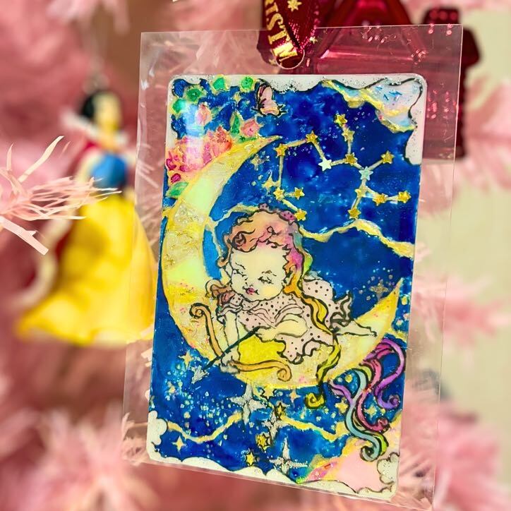 カードサイズのコンパクトなアートだからこそ、キーホルダーとしてカバンや鍵につけても、スマホカバーにいれてもOK。いつでもどこでも、光と一緒に持ち歩けるお守りに。